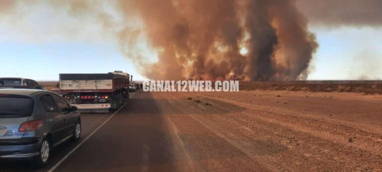 El fuego avanza cerca de la calzada y obligó a interrumpir el tránsito en ambos sentidos. Hay largas filas de vehículos en el acceso a Trelew.